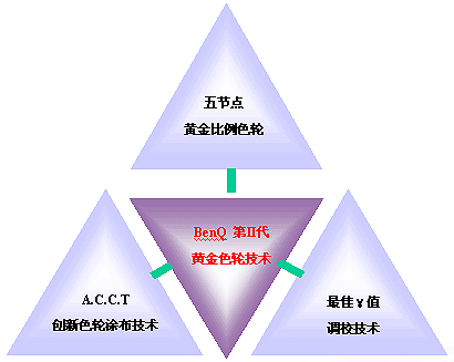 BenQ投影機獨有的第II代黃金色輪技術,由多個重要部分組成,包括領先的五節點黃金比例色輪(提供真實色彩與畫面)、A.C.C.T色輪涂布技術(令色彩更飽和,增加全域色彩的表現范圍)、最佳化Gamma曲線調校技術(確保輸入端影像精準無誤地投射),以及通過NSTL國際權威認證的sRGB真實色彩模式(確保在不同的數字顯示產品中看到相同的色彩表現,提供最舒適的視覺感受和真實的圖像還原)。當DLP數字投影機逐漸成為市場主流,誰能在細節上投入更多的力量,誰能真正從使用者體驗出發,誰就擁有了獨一無二的競爭力。旨在還原真實自然色彩,全面提升投影顯示效果的BenQ第II代黃金色輪技術,它的問世大幅提升了DLP數碼式投影機的色彩表現能力。