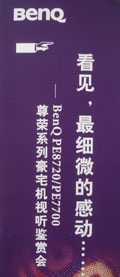 進行完BenQ PE7700與SANYO PLV-Z4的一組對比以后,BenQ的高端旗艦產品PE8720登場了,其依然連接的是HTPC播放器,先播放了一段1080i“大象傳奇”的快速移動片斷,這也是一部動畫科幻電影,其中飛速爬升的飛艇以及年輕人和老人的肌膚對比了令人印象深刻,特別是一段快速下落的片斷,表現了BenQ PE8720在影像處理速度方面的優勢。之后重新播放“超人總動員”、“騎士傳奇”和“記憶裂痕”的片斷,令觀賞者對其有一個對比的認識,總體上來說,BenQ PE8720與PE7700的畫面表現效果類似,但是在景深表現方面更勝一籌,在色彩方面,則更為純正,比PE7700的色彩飽和表現有所調和。