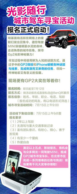 現明基面向活躍在微博、論壇、SNS上的朋友發出召集令,邀您駕駛Mini穿越鋼筋水泥的森林,走進熟悉的城市街角,探尋GP2光影神秘魅力!與眾多網友一同駕駛Mini,組成GP2城市尋寶車隊,在北京市區完成一系列艱難的任務與挑戰!