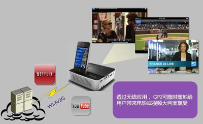 作為專為iPhone\iPod量身定制的微投影機,GP2自帶全能基座。您只需將iPhone插入明基投影機GP2頂部插槽,便可將手機中的高清影片瞬間投射在墻面上,最大80英寸的超大畫面讓你爽到High!你還可透過無線網絡與應用程序直接欣賞網絡視頻;分享照片、文檔同樣也是輕輕松松。