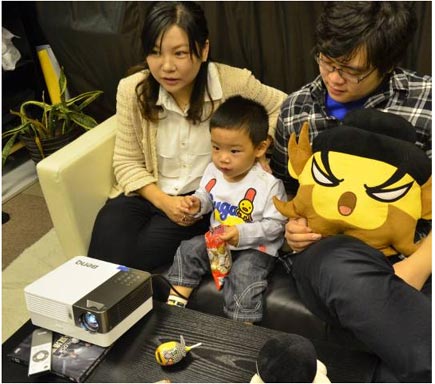 “臥室、書房、餐廳、花園……這臺微型投影機哪兒都可以用,隨處都能跟孩子做游戲、看動畫和早教光碟。”方女士說: