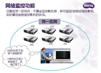 對大中型企業客戶、教學單位來說,同時在多會議室或教室內部署明基MW721投影儀并透過局域網進行遠程監控管理,是擁有高品質投影效果又兼具最佳成本效益的解決方案。MW721的網絡監控功能可實現一臺電腦控制多臺MW721的工作狀態,比如開關投影機、切換信號源等。明基MW721支持Crestron