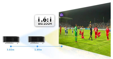 而明基W1500無線家用投影機的靈活性,還表現在它裝備了一個具有1.6倍大變焦比的鏡頭,外加介于110%-130%范圍之內的鏡頭垂直位移功能,因此開機之后可毫不費力地把畫面調整到最適宜、最舒適的狀態。更加令人稱道的,還有明基W1500采用了領先的短焦投影技術,差不多短短2.3米左右的距離,就可投射出100吋以上超大尺寸畫面。話說咱家客廳的面積并不是很大,因此明基W1500家用投影機真是太對味了。