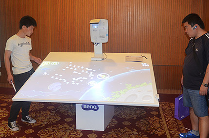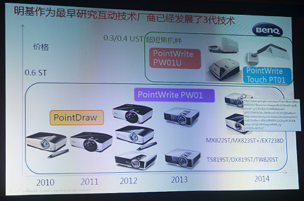 不僅如此,明基還將PointWrite互動技術發展到更大的畫面,巡展上將展出由超短焦新品MW853UST(3200流明/0.35超短焦)組建的雙機雙畫面無塵黑板互動方案,在4米*1.3米的黑板上制造一個可多點觸控畫面,實現多人同時的互動書寫。使用者可以在巨大的黑板任何一個地方觸控,可以從畫面的一端連續的書寫至另一端,途中筆跡流暢而不斷筆;在不使用投影機時,它又變成了一個普通的無塵黑板,使用水性書寫筆在表面板書,用配套的粉筆擦輕輕一抹便可了無痕跡,這個方案在實際教室安裝時可以直接取代傳統粉塵式黑板,可滿足普通教室甚至階梯大教室的觀看需求。