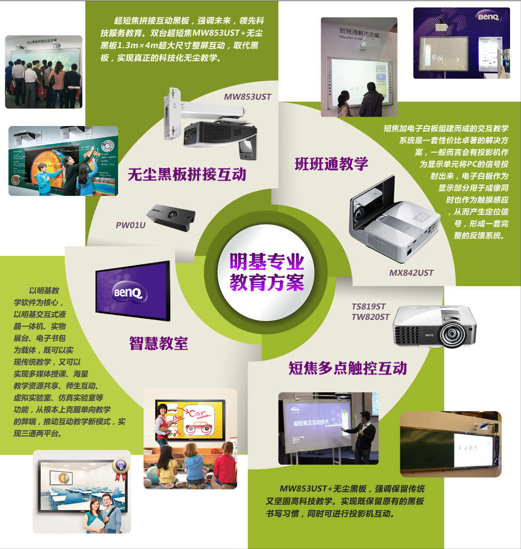 可以看到,教育投影市場擁有廣闊的市場空間和很好的發展前景。根據前景咨詢的數據統計,目前中國教育投影市場約75%為短焦、超短焦投影機產品,可見短焦機型已成為教育領域的核心產品選擇。而在市場中,明基是擁有最為強大的短焦、超短焦投影機產品線的廠商之一,依托強大而品牌形象和技術實力,明基打造了業界領先的產品陣列,以短焦、超短焦技術為核心,提供最為全面的技術與配置組合,囊括了強大的多點交互觸控功能,節能、防塵、創新光源技術、乃至拼接顯示功能等等,多樣化的技術融合,讓不同需求的用戶能夠選擇最合適、最準確的短焦、超短焦投影產品。同時也能夠勝任各種不同的應用環境特點。明基致力于打造最專業的教育解決方案,目前已經完成了無塵黑板拼接互動解決方案、班班通教學解決方案、短焦多點觸控互動解決方案、智慧教室解決方案等四大解決方案,其中還有非常靈活的專業產品和小方案可供教育用戶選擇。可以看到,明基在教育領域的堅持和開拓,下面,讓我們來一起了解明基教育方案的特點與優勢。 |