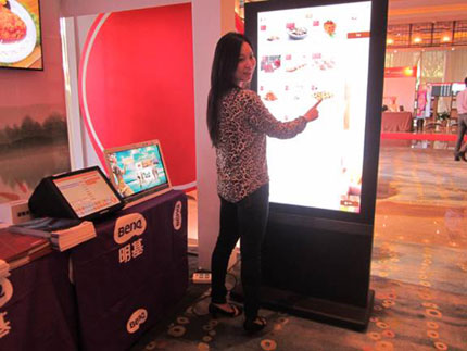 基于很多連鎖餐飲門店常常出現(xiàn)顧客排長隊等位候餐的現(xiàn)狀,明基特別推出智能化自助點餐終端系統(tǒng)。該解決方案以明基DH550C全球最薄55英寸雙面顯示商用大屏為載體,其機身一面可對外呈現(xiàn)促銷信息、播放視頻廣告、展示品牌形象,而另一面則為自助式的點餐系統(tǒng),可讓消費者運用等位間隙,直接選擇心儀菜品并打印出小票,既部分減輕了服務人員的工作量,完全避免錯單、漏單現(xiàn)象的發(fā)生,大幅提高點餐、送餐的效率,又可讓等位期間焦躁不安、無事可做的消費者,獲得更好的時尚用餐新體驗。