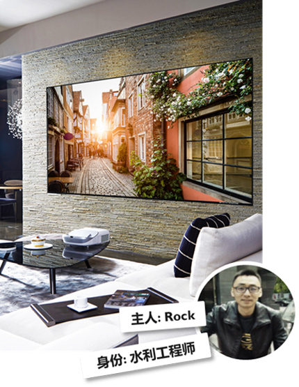 第一次在朋友家看到明基i910,Rock就覺得這款產(chǎn)品是為他量身定制!他在北京城郊的房子完全由自己一手打造,尤其是客廳的墻壁選用特殊效果的瓷磚,帶來如同巖層一般的肌理感。這種感覺就像是在戶外探測(cè)時(shí)看到的整片巖壁,如果安裝電視難免會(huì)破壞整體感。而明基智能超投電視i910配備100吋抗光屏幕,厚度僅僅3cm,超窄邊框也只有1.1cm,掛在墻壁上仿佛巖層上的浮空幻象;另一方面得益于TIR反射光學(xué)構(gòu)架,只需將電視主機(jī)放在距離墻壁55cm的茶幾上,就可打滿100吋超大屏幕。