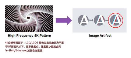4K技術(shù)加劇了LCD/LCOS產(chǎn)品顏色溢出的問題。一方面相同尺寸的畫面下?lián)碛杏酶嘞袼攸c(diǎn),再加上e-Shift/Enhanced技術(shù)的使用,使得紅綠藍(lán)三原色很難合光,圖像邊緣會(huì)出現(xiàn)色彩偏色。而明基4K投影機(jī)W11000采用單片DLP芯片,沒有合光的流程,尤其是在展現(xiàn)精細(xì)畫面時(shí),色彩更加真實(shí)、動(dòng)人。