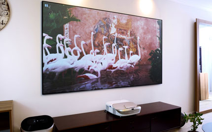 首先,明基智能超投電視i920主機三維僅有389×133.4×431mm,直接放置在電視柜上便能夠讓用戶享受到100吋1080P高清巨幅畫面,在縱身3米左右的客廳都有很不錯的視覺效果。對空間大小和對安裝技術都沒有過多的要求,輕輕松松就能夠創造出屬于自己的私家影院,與她共度甜蜜觀影時光。