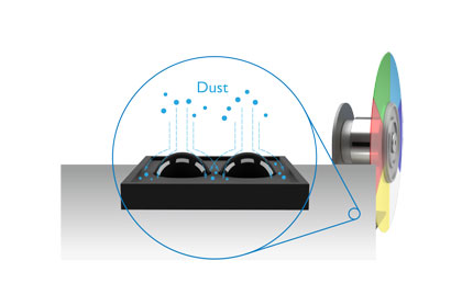 傳統DLP投影機多采用凹型紅外色輪傳感器,利用紅外線在反光面的反射光信號判斷色輪轉動,若有灰塵堆積,覆蓋紅外定位點,光信號傳遞就會受到影響。因此積灰后,投影機常會感應不良造成顏色錯誤甚至突然關機。
