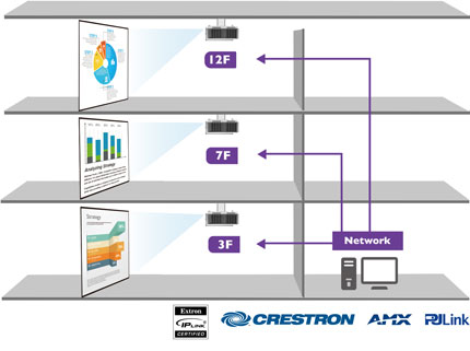 而對于像全員培訓會、年中總結大會、新聞發布會等大型會議,由于參與人數眾多,現場一般需要設置3-5面左右的大屏幕,以方便會場上所有的與會者觀看演講PPT。基于此,明基高清高亮投影機SH753不僅特別增設LAN網絡接口,還支持多種主流品牌的控制協議,廣泛兼容包括Crestron、AMX、Extron和PJ-Link在內的投影機控制系統,通過LAN網絡控制可實現簡報內容的多個屏幕同步展示,既便于會議現場管理,又可減少不同投影機之間,以及投影機與PC間的連線,美化會議環境。