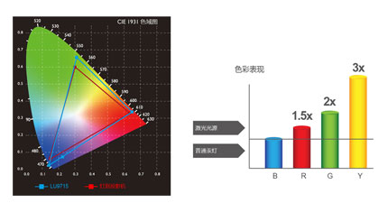 無論是應(yīng)用于展覽展示、會議室或教室,激光工程投影機(jī)都可以創(chuàng)造亮眼的大畫面,這得益于激光光源技術(shù)。相比于汞燈,激光光源的能量轉(zhuǎn)化效率高,光源壽命長,亮度衰減慢,色彩飽和度好。