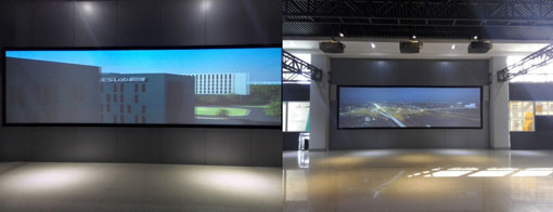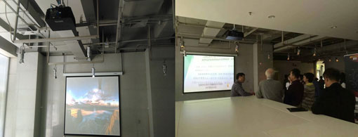 該企業前臺展廳使用3臺6500流明高亮度的工程投影機,以拼接融合的方式打造巨幅投影畫面,簡潔大氣,又極具科技感,充分體現了企業的信息化建設;該專業工程投影機提供7支高分辨率可交換鏡頭,應用雙燈泡投影系統,保持投影亮度。