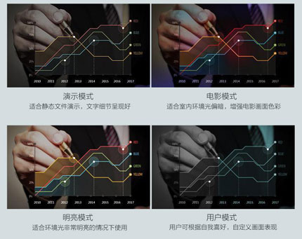 更貼心的是,有鑒于現代會議過程中視頻播放次數的不斷增加,明基E560還特別提供了電影模式,16:10寬屏,讓視頻展示更賞心悅目,兼顧令人滿意的清晰度;而對于一些有特殊需求的用戶,E560也貼心準備了用戶模式,用戶可以根據自我喜好,自由調節畫面表現,大大提升用戶在使用試過程中的滿足感。
