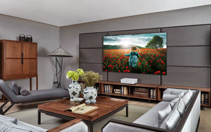 而直觀視覺上,激光超投的外形不比畫面遜色分毫。簡潔設計的主機考究精致,如鉆石切割工藝,每一筆皆淬煉美感。同時,采用微米級柔性抗光屏,3cm超薄屏幕和1.1cm超窄邊框,賦予空間現代輕盈的設計品質。剔除掛架接線等累贅布置,且貼合墻壁,唯一屏一機,內外皆美,彰顯簡約有質感的家居品味。