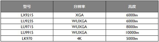 明基激光工程投影機系列共五支機型:LX9215、LU9235、LU9715、LU9915、LK970。除了共同的安裝靈活、燈泡長壽命、密閉防塵等優勢外,還覆蓋多段流明和分辨率規格,分別滿足不同場景應用需求。