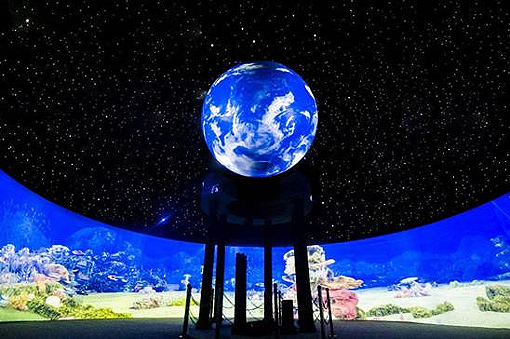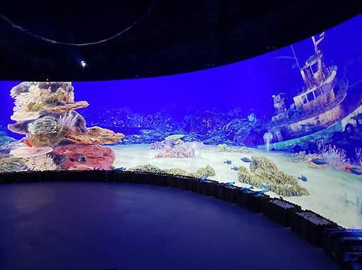 上海世紀匯廣場上矗立著一座海洋沉浸式展館,館內館外游人如織,透過5000流明激光4K和5000流明激光短焦工程投影機,數字化建模內容被融合投影在環形空間內,營造出身臨其境的沉浸式氛圍,引領人們了解未知,探索瑰麗的海洋世界。