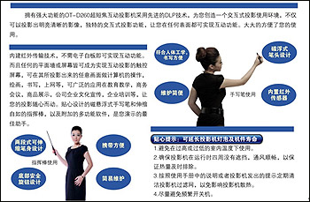 OT-D260全球首創自主獨立技術,將投影機與電子白板有機結合,投影機自身帶有互動演示教學功能。簡易操作,方便攜帶安裝,可在教室或會議室任何屏幕(或投影白板)或墻壁安裝使用,畫面尺寸自由調整。