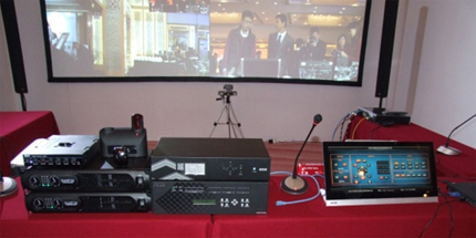 采用兩臺佳能LCOS投影機WUX5000產品,分別顯示遠端和近端視頻,同時采用AMX的中控、矩陣系統,BXB手拉手會議系統桌上型麥克風和最新代理的美國Atlas