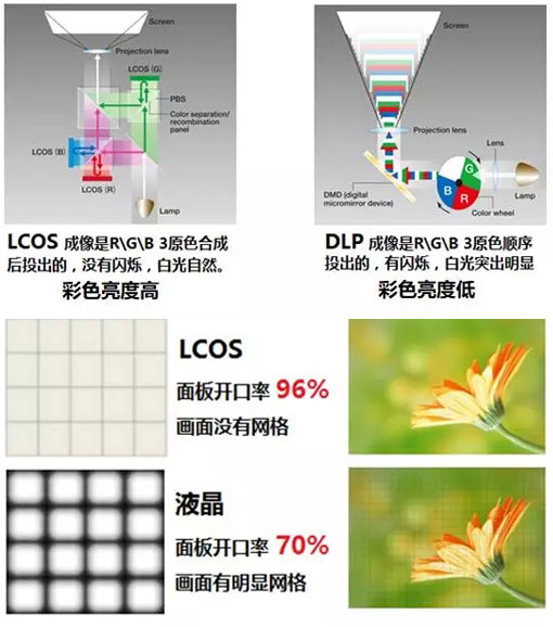 目前市場成熟的投影技術有3種:液晶、DLP(單片/3片)、LCOS。LCOS最晚問世,但是其明顯優勢很快被市場接受。主要體現在彩色亮度高、色域寬、沒有網格。這些優勢與單片DLP系統斷續合成的色彩表現、突兀的白光刺激,和液晶機明顯的網格畫面形成明顯反差。