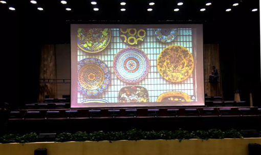 多功能禮堂面積700平米,觀眾席呈階梯形式,有可容納4排階梯桌椅、50個座位的主席臺,從規(guī)模看應屬于大型報告廳。大廳的舞臺配置了一幅300英寸屏幕,盡管環(huán)境光可以控制,按照設計標準應選擇一萬以上流明度的投影機,在用戶權衡了單機高價位,疊加低價位的利弊之后,選擇了日本佳能LCOS投影機:WUX6010,該機具有6000流明彩色亮度,兩臺疊加后具有12000流明彩色亮度,這種疊加的使用方式不僅降低了成本,還帶來了系統(tǒng)冗余備份的功能。佳能WUX6010是2017年推出的機型,使用了佳能最新的光學系統(tǒng)、光學引擎、圖像處理,代表了佳能的最新技術。