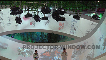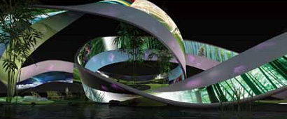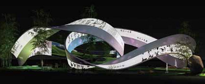 為完美呈現世博會湖南館“都市桃花源”主題,設計者打破了傳統展覽理念,顛覆了過去展覽按章序觀看,形式以實物圖片、影視圖像相對固定的傳統模式,突破了場館內外空間限制。采用魔比思環循環演播滾動,環體和影像相容,使形成內容化為一體,影像在環上形成流動的彩帶,使觀眾產生更多的遐想。 |