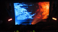 三臺20000ANSI流明科視投影機側立放置于舞臺的最末端,拼接融合成一個15米*7.5米的畫面投射到背投軟幕上,作為舞臺主背景。舞臺前方,位于二層看臺的最前沿擺放兩臺20000ANSI流明科視投影機投影機,拼接融合出18米*7.5米畫面,投射在半透紗幕上。