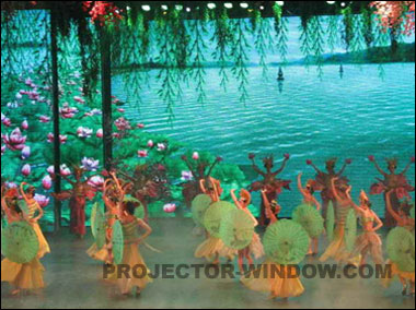 S+20K,主要投射舞臺前端紗幕、舞臺兩側假山、主舞臺三個場景。因配合舞蹈演出,投影位置、投影面積及投影距離要經常變化且數據變化較大,這給投影設備提出了很高的要求?埔曂队皺C采用了4.1-6.9:1變焦鏡頭,可快速靈活變焦,并配合專業的媒體服務器及燈光控制臺,最終實現了高難度的畫面變幻。