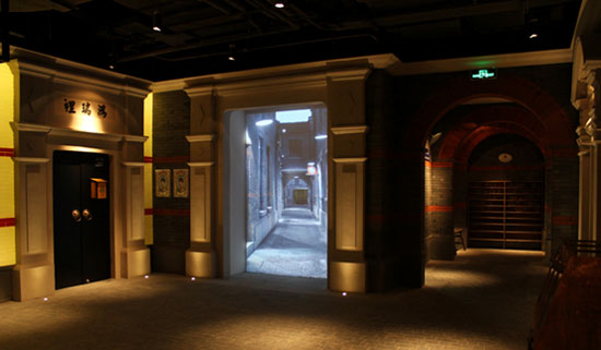穿過用投影機投出虛擬的旋轉門就到了老上海的百樂門,百樂門的正前方有一個小舞臺,采用科視投影機,投射舞臺整體背景或播放老電影。繼續向前就進入了老上海的石庫門,石庫門高為2.7米,寬1.8米的真實比例的造型幕。采用科視投影機進行9:16的投射。由于建筑主體結構的限制,此處投影設計了一次反射。 |