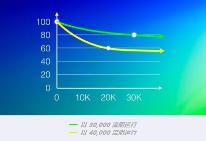 激光光源持久穩定,以 30,000 流明運行 30,000 小時后亮度仍達 80%。以 40,000
