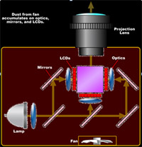 LCD投影機(jī)必須適用粉塵過(guò)濾網(wǎng),事實(shí)上并不能阻擋所有粉塵,需要頻繁清洗(3個(gè)月清洗一次),成本提高
