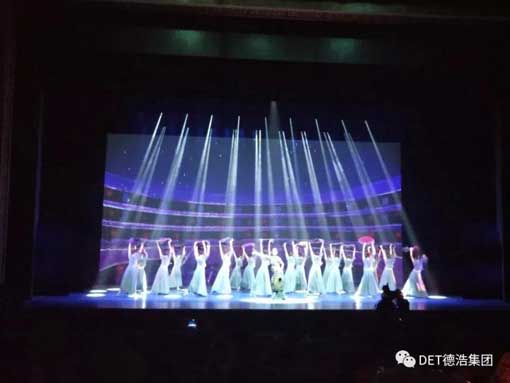整個(gè)舞臺(tái)分2套投影系統(tǒng),正面一道紗幕16*8米,由DET 20000流明 DET-S20K投影;