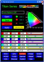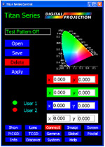 首先,投影機的光學性能要設計成有一個基本寬的色彩范圍或者是全色域。色域決定于燈泡的選擇和色濾鏡的使用,色濾鏡可以分離出為DLP顯示而準備的色彩。接下來就是使用增強型七點色彩矯正技術,投影機的安裝者將需要用一個“Photo-spectrometer”在屏幕上測量基色,這臺設備將精確的測試出投影機所需的數值。這個測試被稱為測量色域(MCGD)。這個測量必須在指定的光條件下進行并且確保測試環境達到標準。一旦安裝者已經測試過“MCGD”,就可以通過一臺計算機(例如:IE瀏覽器)來訪問投影機,通常使用WEB訪問。投影機提供者或者主機提供一個應用程序,避免在計算機上來安裝應用軟件。