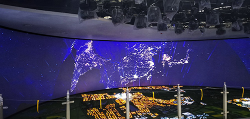 數字沙盤作為荊門(國家)高新區招商展示服務中心的主要展項,DP采用了5通道正投融合的方式,投射在弧長31.5m,高4m的屏幕上,在有限的室內空間中,超長的巨幕無疑是最大的亮點,而巨幕下呈現的高清影像畫面帶給你沉浸感十足的現場體驗。