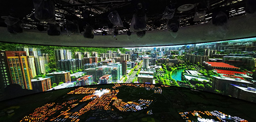 其位于中間的數字沙盤與后面的超長弧幕融為一體,全方位立體的展示了城市的發展變化,多媒體互動科技的加入,伴隨著立體聲效解說,把未來高新區鳥瞰圖生動地搬到了參觀者的面前,讓我們沉浸其中,更加生動的感受到科技的進步,未來城市的發展。而DP投影機憑借其系統穩定性以及卓越的性能也贏得了客戶的信賴。