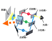 為了解不同技術的投影機對于以上測量方法的不同表現(xiàn),我們需要先了解一下3LCD技術和單片DLP技術的成像原理。3LCD技術的成像原理(圖2)同我們常見的顯示器,電視,數(shù)碼相機的彩色成像設備一樣,都采用了3色成像原理,即采用紅,綠,藍三原色合成色彩。并且目前來自所有的視頻,DVD,HD,數(shù)碼相機以及計算機信號等都以RGB色彩范圍解析。根據(jù)楊-赫姆霍爾茲的三色學說,紅,綠,藍三原色可以混合合成所有不同色彩,這同人眼的視覺特性有關。