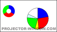 圖3所示的是單片DLP(4色輪)的成像原理,可以看到,采用的是三原色和白色的合成影像。一般單片DLP為什么不采用標準的三原色合成影像呢?這需要從單片和3片的不同說起。采用單片DLP成像,紅,綠,藍三原色畫面是分時的,當投射紅色畫面時,不能同時投射綠色和藍色畫面,光源發(fā)出的白色光,經(jīng)過色輪的紅色段,只有紅色可以通過,則此時的綠色和藍色光被過濾損失了,不能用于投射影像。如果不考慮各種色光的亮度區(qū)別,則每時透過的色光只有總色光的1/3,大量的光能被浪費了。投影機標注的亮度只是100%全白圖像的測量亮度,為了增加白色畫面的測量亮度,在商用單片DLP投影機上,基本上采用了增加白色段的方法。在白色段,紅,綠,藍可以全部通過,通過的光量不是1/3了,大大提高了圖像上白色的亮度,從而使標注的亮度測量值有了極大的提高,但此時,畫面上的彩色,并沒有相應提高。彩色的亮度仍然處在一個相對較低的水平,這樣就破壞了色彩的平衡;同時使投射的色彩亮度遠達不到標注的對應水平,僅僅是標注的亮度提高了。直觀的感受就是白色較為刺眼,彩色較暗,色彩暗淡。對于極致色彩技術,是在色輪中加入白色,青色,黃色或其他顏色。其最為主要的目的是提高光的通過率,并提高相關顏色的亮度。以黃色段為例,黃色是由紅色和綠色組成,在色輪轉(zhuǎn)到黃色段時,紅光和綠光可以同時通過,這使得總色光的2/3得以投射,此時提高了光的利用效率。但是由于投影機采用的是加色法成像,紅色和綠色光可以合成黃色,但黃色光卻不能投射到紅色和綠色的畫面上,這又相應降低了紅色和綠色的亮度。因為色輪是360度,是有限的,每增加一個顏色,就會相應降低另一個顏色所占比例。也就是降低了其他顏色的亮度。