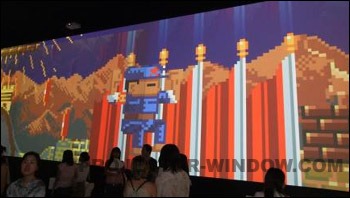 在尤倫斯當代藝術中心高大氣派的中央甬道內,兩幅壯觀的游戲場景赫然呈現在觀眾面前。清晰明亮、超大的互動游戲畫面,讓觀眾不禁為之振奮。在《長征:重啟》作品中,數碼和手工、歷史與當下巧妙地融合在一起,以互動視頻游戲的形式,并且大量地運用了藝術家早期繪畫和新媒體創作的元素,可謂獨出心裁。在暗化處理的甬道內,由北京萬星富視科技有限公司負責安裝的,懸于頂部的八臺愛普生G5300出盡了風頭, 其5200流明的高亮度、豐富的色彩表現力以及無縫拼接技術所通力打造的超大完美畫面,讓與會觀眾佇足停留的時間很長,似乎忘了還有其他精彩的藝術品展示在等著他們。