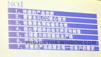 EPSON產品之所以能取得成功,主要是有以下幾點奧秘:EPSON是市場的開拓者;3LCD技術造就完美的投影機;覆蓋全球的銷售及服務網絡; 自主研發的核心組件;產品的高可靠性;環境友好政策以及全面的生產線。 河原崎雅子小姐重點講解了家用產品線,今年EPSON有兩個系列的新產品,一個是使用了反射型面板的高端機型,另一個是升級型入門產品。2010年,愛普生家用銷售策略是,用低成本產品來擴大市場份額,用高畫質、高價值的產品進入新的市場,來滿足用戶的需求。高端投影機的目標是對AV產品有很大的興趣,希望享受最佳品質影像,并將投影機裝在專門的影音室的客戶。入門級1080P投影機是在客廳使用,目標是初次購買和有升級換代需求的普通用戶。 同時,雅子小姐表示,EPSON對家用產品線很有信心,其高端投影機的優勢在于擁有很高的對比度、反射式液晶面板,全線的超平滑自動光圈,擺放靈活、自動變焦、鏡頭移動,占用體積小等。入門級1080P投影機的優勢則是亮度較高(適合客廳使用),全新的電影濾鏡;擺放靈活,變焦鏡頭、鏡頭移動等。