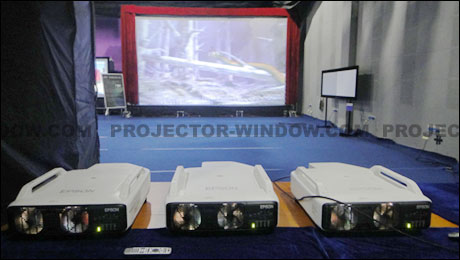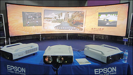本次展會中關注度最高的“高清疊加投影方案”便是使用三臺6000流明高亮度的EB-Z8000WU高清投影機左右排列來投放出完全疊加重合的圖像的。該方案中即便有一臺投影機無法正常工作,另兩臺仍可以繼續運行,保證用戶的連續使用。另一個奪目的“雙通道超短焦融合互動白板投影方案”則是使用愛普生EB-450W超短焦投影機和優勢寬屏交互式電子白板結合,很好的實現了超短焦、超大寬屏﹑高亮度投影,令用戶感受極具沖擊力的顯示效果。而EB-C400WU也不甘示弱,其在“高清平面背投方案”中的表現堪稱完美,通過背投方式將影像和圖像投影出來給觀眾觀看。此系統優勢之處便是投影影像的高清輸出,讓用戶即使在亮度較高的場所,也能夠看到清晰、明亮、絢麗的圖像。