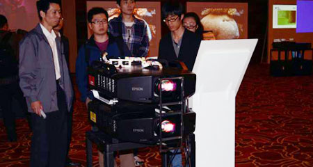 高清被動立體投影方案是將3D視頻信號傳輸到兩臺垂直疊加的EB-Z9750WU高清投影機上,再借助被動立體眼鏡實現3D立體投影的應用。現場還展示了大屏幕投影方案、超短焦互動投影方案和便攜式投影解決方案。以上展出的投影機解決方案,為大型科技館、博物館、大型展會、影院、模擬訓練、仿真系統、大教室和大型商務會議等提供了全面的應用,充分顯示了愛普生投影機產品獨特的科技魅力,同時也得到了來自全國各地的愛普生投影機經銷商的充分肯定。