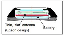 如何維持外形設計輕薄小巧是研發團隊亟待解決的第三大難題。下圖2所示為普通類型GPS跑步記錄設備的外形和裝配圖,使用者在佩戴該款產品跑步時,其天線的安裝角度近乎垂直,導致該款產品外形過于厚重。因此如圖3所示,愛普生重新調整了其內置天線的形狀,改良其接收角度,并通過將天線與電池層疊安裝保障了產品自身的輕薄性能。