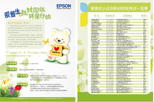 自2013年1月21日開始,愛普生一年一度的“耗材回收環保行動”將再次啟動,活動將同時在全國53家愛普生認證店展開(53家認證店詳情請登陸www.epson.com.cn/hs)。在2013年1月21日至2013年4月20日,顧客在愛普生認證店耗材回收網點,將使用完畢的愛普生正品墨盒5只以上(含5只)一次性交給店面工作人員并進行相關登記后,即可獲得愛普生精心準備的新年禮物——愛普生正品照片打印紙一包(20張裝),每店禮品50份,送完為止。