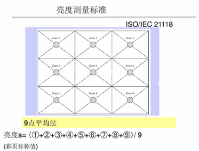 目前,我們使用的測(cè)量方法是在100%全白的圖像上,對(duì)屏幕上9點(diǎn)亮度進(jìn)行實(shí)際測(cè)量,測(cè)量的流明值,是通過(guò)9點(diǎn)亮度平均值(勒克斯)乘以圖像面積(平方米)來(lái)進(jìn)行計(jì)算的,實(shí)際上我們只考慮了白色平均的亮度值。這種測(cè)算方法,很顯然忽略了其他顏色輸出的亮度平均值的計(jì)算,所以根本上說(shuō),現(xiàn)在的流明數(shù)值只能表現(xiàn)產(chǎn)品在白色輸出的亮度表現(xiàn),并沒(méi)有兼顧到彩色輸出的表現(xiàn),所以我們看到了上述投影畫(huà)面出現(xiàn)了色彩明暗的變化。