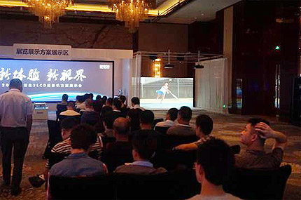 在展會現場,眾多參觀者駐足在一塊L型的屏幕前方參觀。站在“L型”的幕布前方,眼睛隨著視頻場景的變化而變動,整個人就好像快飛起來了一樣,仿佛“身臨其境”。