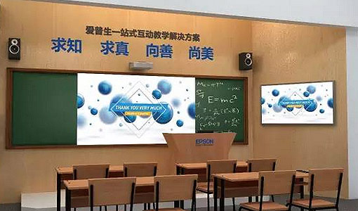 中學區域應用的是愛普生一站式互動教學解決方案,產品為愛普生3LCD投影機CB-595Wi、多功能投影板、環保白板筆、SMART