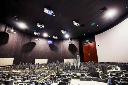 展廳內部,一個直徑長達8米的實體沙盤位列正中,其上布滿了大大小小樓宇模型,一面12米×3米的弧形大屏幕佇立在沙盤的后面,使得原本空間不大的展廳頓時有些“擁擠”。在展廳的安裝中,工作人員主要考慮的是現場光線的問題,既最大限度降低弧形屏幕的亮度對沙盤投影效果的影響,同時投影機也要讓弧形屏幕畫面完整、畫質清晰、色彩艷麗,讓屏幕的亮度與沙盤的投影亮度能夠完美融合。在安裝過程中,工作人員采用吊頂安裝的方法,分別為弧形大屏和沙盤安裝了合適角度的投影機,5000:1的對比度和1024×768分辨率可以勝任展廳內的投影需求,10臺愛普生CB-G6150工程投影機通過定制演示片源,將沙盤及弧幕融合為整體投影畫面,給觀者震撼的視頻盛宴。