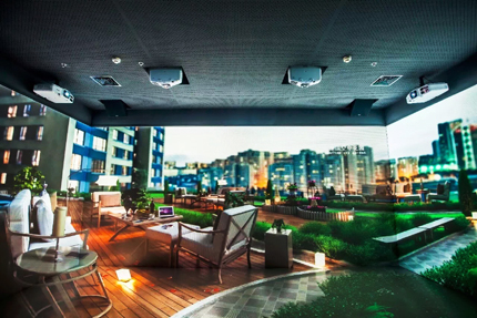 為進一步提升看房客的參觀體驗,售樓處特意設置“影院”展廳,工作人員利用投影機內置的融合功能使“影院”的3面墻體和地面可融合成為一個整體的投影畫面,豐富的接口可以滿足樓盤工作人員鏈接筆記本電腦、Ipad等移動設備需要,為樓盤項目演示視頻提供更多的來源,投出的畫面清晰、明亮,效果立體、逼真,使得觀者有身臨其境的深切感受,效果震撼。