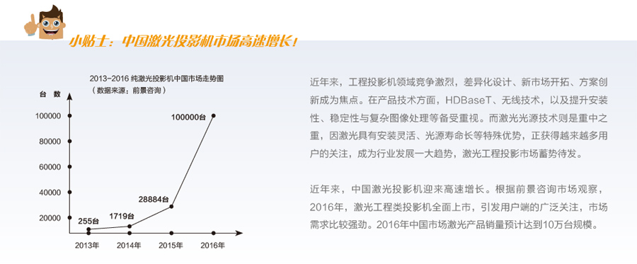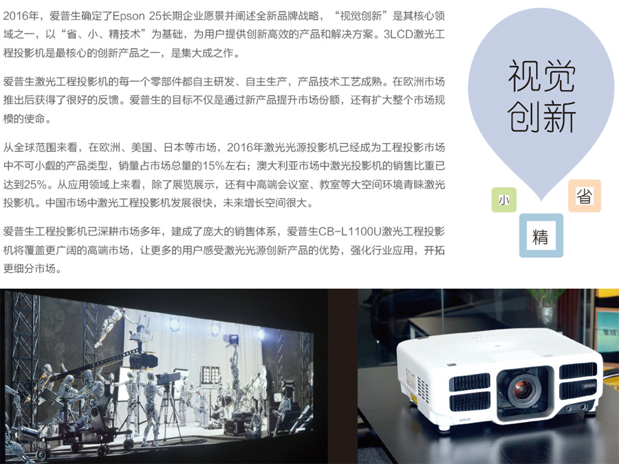 激光光源技術是投影行業發展的重要趨勢之一,作為投影核心技術3LCD的創造者,愛普生工程新品體現3LCD的高影像品質及色彩再現性的優勢;采用密封的光路設計,防止灰塵進入,擁有長達20,000小時的使用壽命,并且鏡頭陣容更豐富,功能表現更強大,滿足行業用戶的多樣化需求。 |