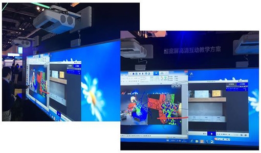 在這一超寬投影畫面上,老師可以直接移動圖片、進行內(nèi)容批注等,師生們還可以8人(6人使用手指,2人使用互動電子筆)同時在投影屏幕上直接書寫,不會發(fā)生任何干擾和信號卡頓現(xiàn)象。